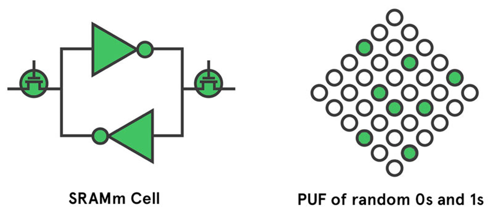 目前基于SRAM的PUF实现技术,是应用广泛的主流技术。静态随机存储PUF(SRAM PUF),SRAM PUF通过对称的SRAM存储器元件搭建双稳态触发器电路,由于制造过程中的不可控偏差,导致每个SRAM PUF基本存储单元在通电后,更倾向于稳定在两个稳定状态(高/低逻辑电平)的某一个。在此,挑战是SRAM单元的地址,响应是地址对应存储单元的逻辑电平状态。