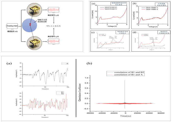 量子隧穿器件孪生特性。晶圆相邻位置筛选出的孪生超晶格器件,具有极其相近的物理函数表现,在同一输入信号的激励下,物理函数输出近乎相同,相关系数超过95%。